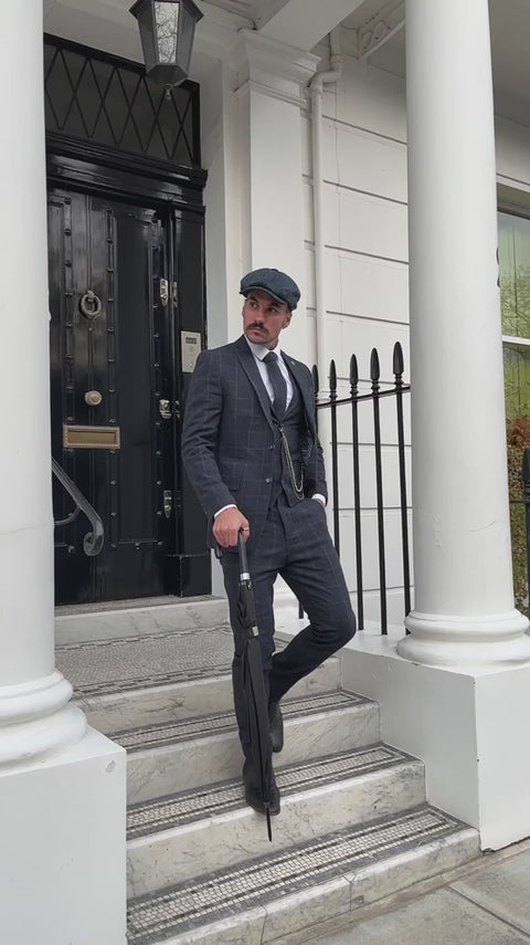 Terno masculino de 3 peças em lã tweed azul marinho xadrez marrom estilo Gatsby dos anos 1920